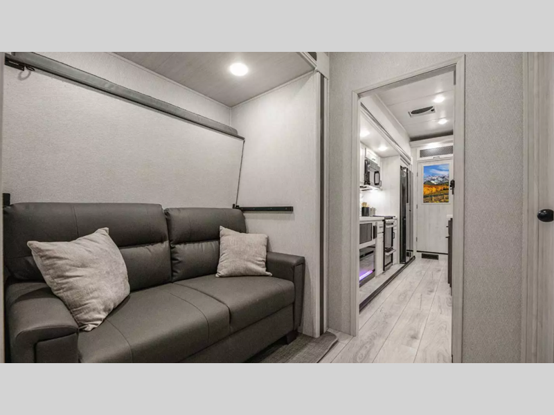 A six-point hydraulic automatic leveling system allows you to set up quickly at camp, and the second adjustable power awning with LED lights is an added layer of protection as you spend time outdoors. Inside, you'll love the solid surface countertops in the bath and kitchen, Slow Rise roller shades, and soft close hardwood cabinet doors and drawers. The Climate Package features Azdel laminated sidewalls, dual attic vents, a high-efficiency triple A/C system, and more features that will help you camp in cold and hot climates.