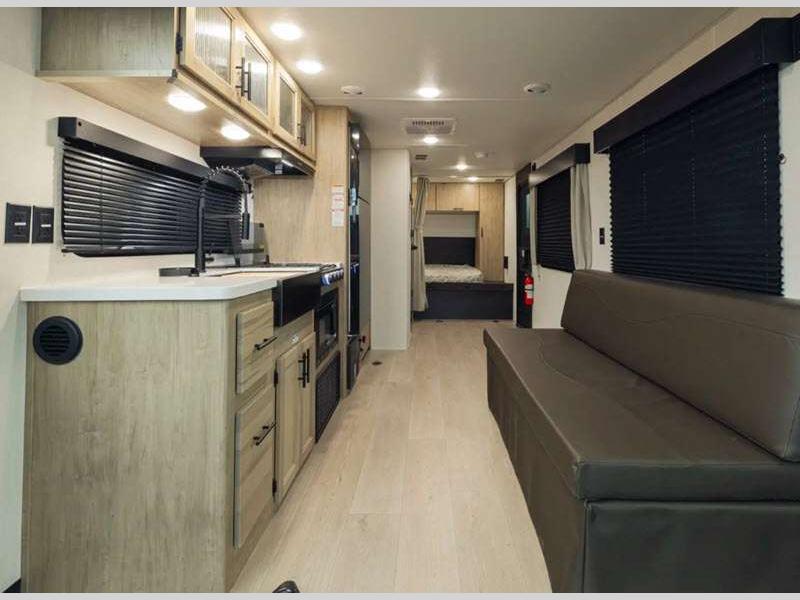 Sleeps 6 Slides 1 Length 34 ft 2 in Ext Width 8 ft Ext Height 10 ft 8 in Int Height 0 ft Hitch Weight 1244 lbs GVWR 9995 lbs Dry Weight 7355 lbs Cargo Capacity 2640 lbs Fresh Water Capacity 52 gals Grey Water Capacity 38 gals Black Water Capacity 38 gals Furnace BTU 20000 btu Available Beds RV King Refrigerator Type 12V Cooktop Burners 3 Number of Awnings 1 Garage Size 11 ft Water Heater Type Tankless AC BTU 15000 btu Awning Info 15' Full Length Power w/LED Light Strip Axle Count 2 Shower Type Standard Solar Wattage 200 watts Similar Floorplans