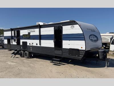 Sleeps 9 Slides 1 Length 37 ft 7 in Ext Width 8 ft Ext Height 10 ft 6 in Hitch Weight 1083 lbs GVWR 8083 lbs Dry Weight 7356 lbs Cargo Capacity 727 lbs Fresh Water Capacity 52 gals Grey Water Capacity 38 gals Black Water Capacity 38 gals Number Of Bunks 2 Available Beds RV King Number of Awnings 1 Awning Info 15' Axle Count 2 Shower Type Standard Similar Travel Trailer Floorplans