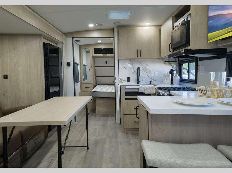 Sleeps 5 Slides 2 Length 32 ft 3 in Ext Width 8 ft Ext Height 11 ft 2 in Int Height 6 ft 6 in Hitch Weight 812 lbs GVWR 10195 lbs Dry Weight 7546 lbs Fresh Water Capacity 45 gals Grey Water Capacity 82 gals Black Water Capacity 45 gals Tire Size ST225/75R15LRE Furnace BTU 30000 btu Number Of Bunks 1 Available Beds Queen Refrigerator Type 12V Refrigerator Size 10 cu ft Cooktop Burners 3 Shower Size 30" x 36" Number of Awnings 1 LP Tank Capacity 20 lbs Water Heater Type Tankless On Demand AC BTU 15000 btu TV Info LR Hi Def LED TV Awning Info 21' Power Adjustable w/LED Lights Axle Count 2 Number of LP Tanks 2 Shower Type Walk-In Shower Electrical Service 50 amp Solar Wattage 200 watts Similar Floorplans