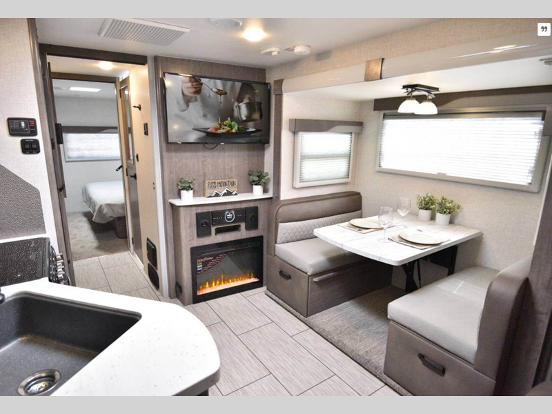 Each model is constructed with thermopane Euro windows, a molded fiberglass front cap, and Azdel interior panel walls for durability. There is Lite-Ply cabinet construction inside, along with Surf-X suedo solid surface lightweight countertops and tables, decorative backsplash, and many more interior comforts. Outside, the Keyed-Alike storage compartment doors will keep your gear secure and the exterior wash station will make it easy to wash off camp gear.